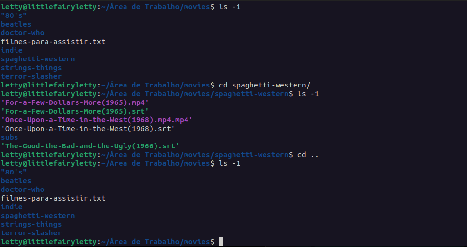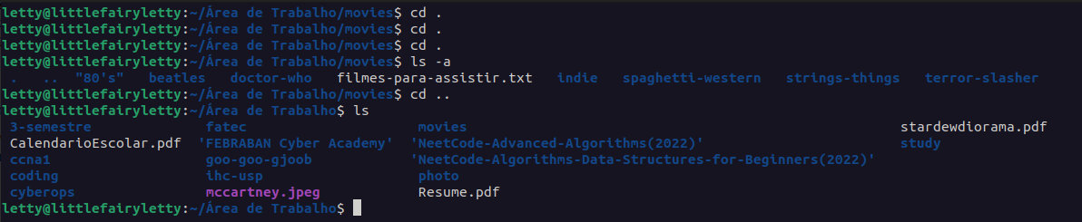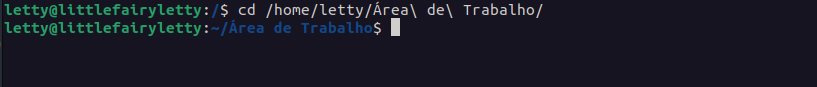 Obs: É uma boa prática salvar arquivos e diretórios sem separações, pois no shell os espaçamentos são caracteres especiais, e a barra invertida `\` é usada como um carácter para informar ao shell que o espaço não deve ser interpretado como um separador, mas sim como parte do nome do diretório. Por exemplo, quando digitamos o comando `ls -lh` tem um separador entre o ls e -lh, e para o shell saber que Área de Trabalho é o nome do diretório e não uma sequência de comandos, deve usar o \ entre cada espaçamento. Então, é comum a prática de evitar espaços e caracteres especiais ao nomear arquivos e diretórios no linux, use \_/- ou até separe assim **IssoEUmArquivo**.